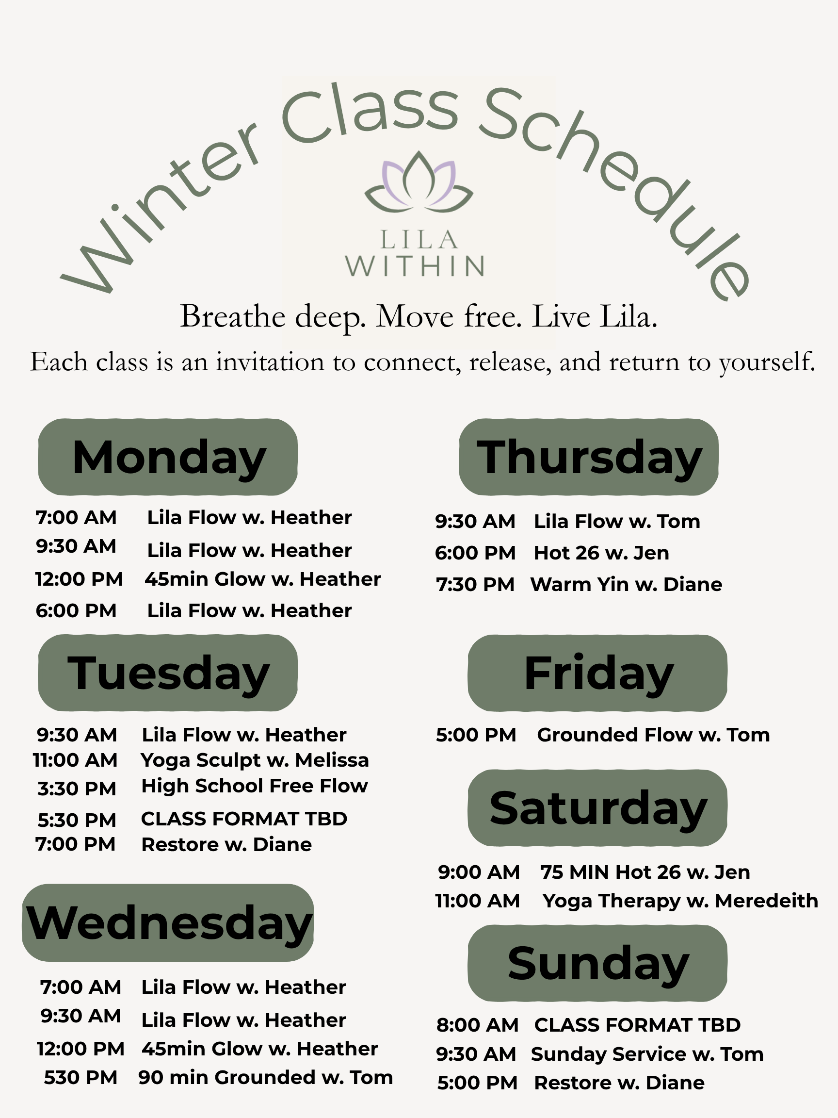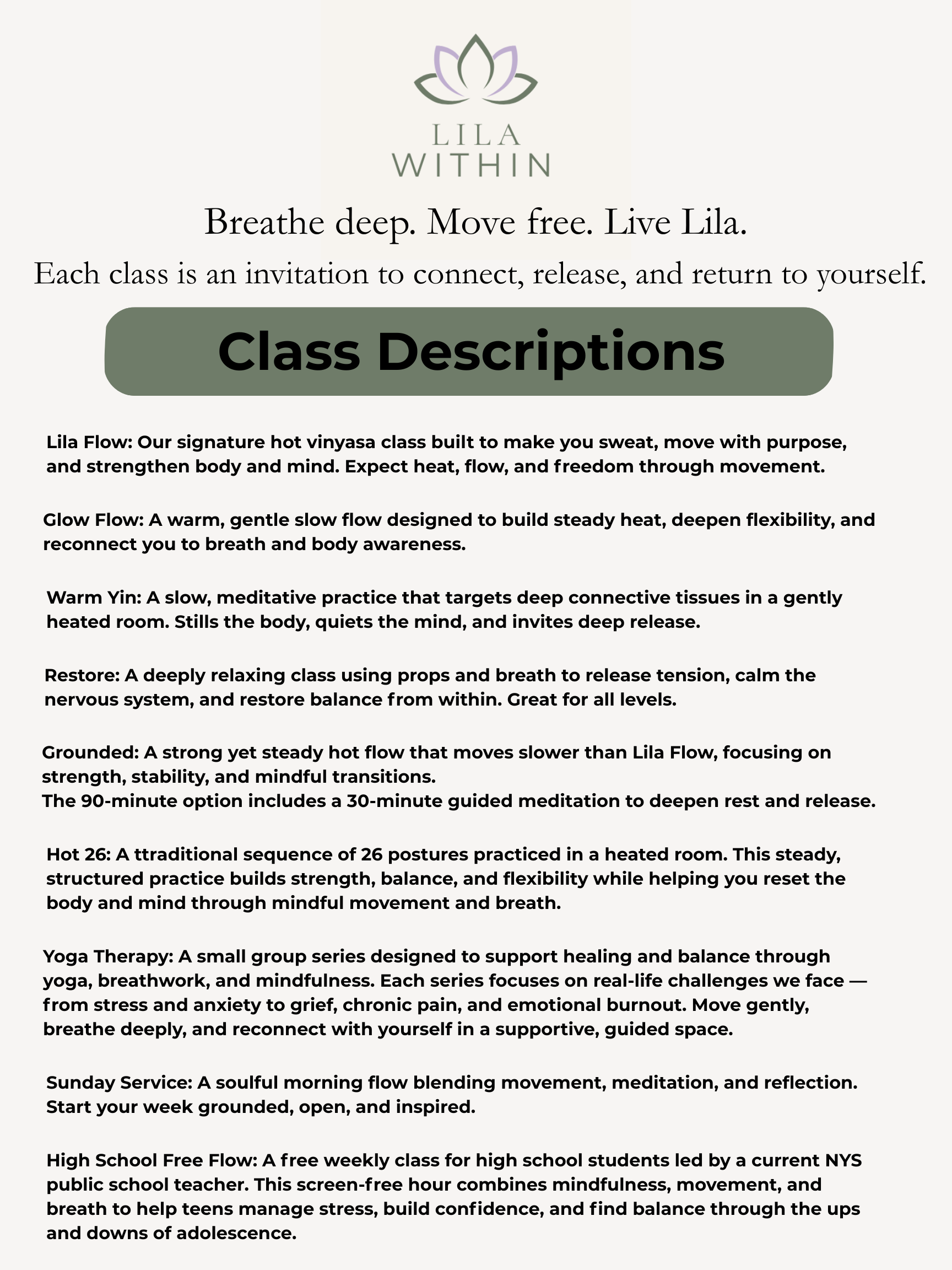 Each class is a beginning, middle, and end — including savasana. Out of respect for yourself and others, plan to stay for the full experience.